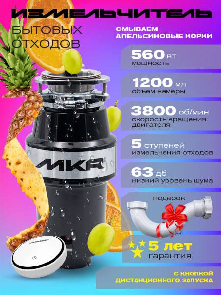 The MKR FWD-1 kitchen food waste disposer is a powerful and efficient solution for quick, safe, and hygienic waste disposal. Its robust induction motor ensures rapid grinding of food scraps using centrifugal force and cam-action grinding. The continuous-feed design (1200ml capacity) accommodates any sink with a 90mm drain opening. Easy to install and use, this compact and lightweight unit features a patented 5-stage grinding system for exceptionally fine processing, minimizing noise (≤63dB) and saving you valuable time. The durable titanium-reinforced stainless steel grinding chamber resists corrosion and prevents clogs, keeping your sink clean, fresh, and odor-free. Automatic shutoff and a 3800 RPM grinding speed provide optimal performance and convenience. Say goodbye to messy sink disposal and hello to kitchen cleanliness! 220V/50Hz.