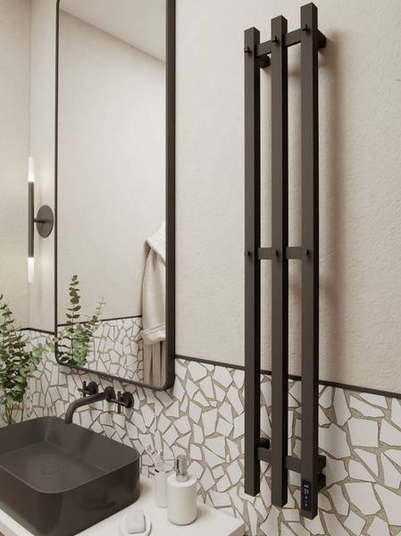 The GR-128 electric towel warmer boasts a unique, custom design crafted from square profile tubing in a stylish matte black finish. Its convenient right-side dimmer switch (control panel) and integrated thermostat provide precise temperature control. Enjoy three heating modes and a timer for customized comfort. Simple plug-and-play installation makes setup a breeze, while the concealed mounting box keeps wires hidden for a clean, polished look. Perfect for bathrooms, kitchens, utility rooms, cabins, garages – anywhere you need supplemental warmth. Features automatic shutoff at 60-65°C and an IPX4 water resistance rating.