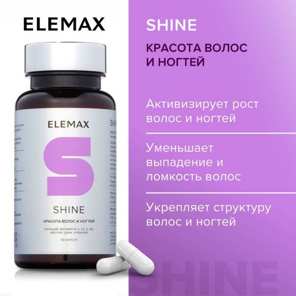 ELEMAX Shine, hair vitamins, nail vitamins, hair growth supplement, hair loss prevention, multivitamin for women, biotin, vitamin D, vitamin E, zinc, silicon, horsetail extract, nettle extract, hair strengthening, nail strengthening, healthy hair, healthy nails, women's health supplement, 60 capsules, 500mg, hair and nail growth, alopecia, dandruff, brittle nails, breakage, hair shine.