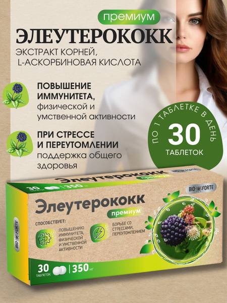 <img src="eleutherococcus-tablets.jpg" alt="BioForte Eleutherococcus Premium Tablets 350mg 30 count">Keywords: Eleutherococcus, Eleutherococcus senticosus, Siberian ginseng, adaptogen, immune support, cognitive function, memory, focus, concentration, stress relief, fatigue, energy, vitamin C, dietary supplement, herbal supplement, BioForte, tablets, 350mg, 30 count