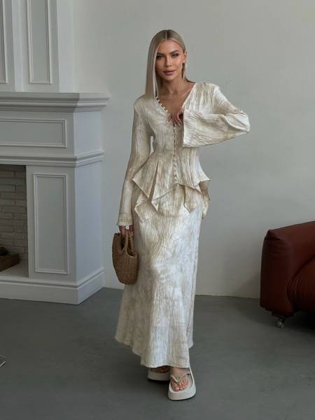 Description: Elevate your style with the EMBERENS clothing set, a universally flattering ensemble perfect for both business meetings and special occasions. The fitted blouse accentuates your figure with its flattering silhouette and airy, flared sleeves. Delicate fabric-covered buttons add a touch of refined detail. The maxi skirt, featuring a comfortable hidden elastic waistband, creates an elegant and graceful silhouette that effortlessly elongates your frame. Suitable for all body types and heights, this stylish summer skirt suit is equally at home during the workday or at a wedding, graduation, anniversary, corporate event, or birthday celebration. A versatile and comfortable addition to your wardrobe, the EMBERENS skirt suit offers effortless style and timeless elegance. Make a statement and diversify your look with this exceptional ensemble.