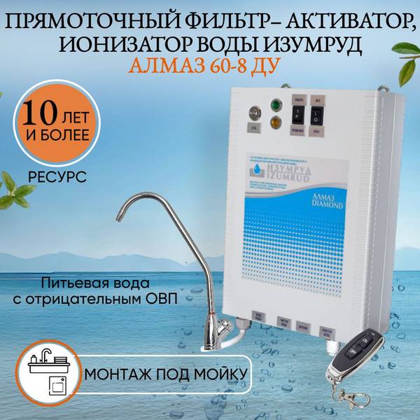 Under-sink water filter, water ionizer, water activator, Emerald KF, Diamond 60-8, purified water, antioxidant water, alkaline water, electro-chemical activation, ORP, pH balance, cartridge-free filter, under-sink installation, water purification system, healthy water, drinking water filter, reverse osmosis compatible, water filtration system, clean drinking water, improved hydration, home water ionizer, alkaline water filter, mineral water filter.
