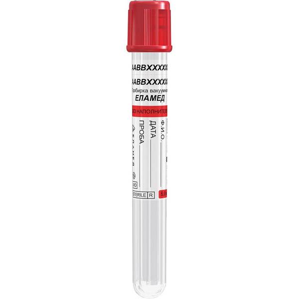 Elamed 6ml vacuum blood collection tubes are ideal for various laboratory applications, including biochemical, immunological, and serological testing, as well as secondary tubes and aliquoting. Suitable for serum, citrate plasma, heparinized plasma, and whole blood, these sterile, non-additive tubes (ZER 13100, 12308) offer a 100mm height and 13mm diameter. The non-screw cap features a butyl rubber stopper in an HDPE protective cap, minimizing needle damage during automated processing. Each tube is clearly labeled (Russian) with manufacturer details, lot number, sterility indicator, single-use designation, expiry date, and "in vitro diagnostic use only" marking. These red-top tubes come in a polystyrene rack, shrink-wrapped for sterility, in 100-tube packs. Buy bulk blood collection tubes today!