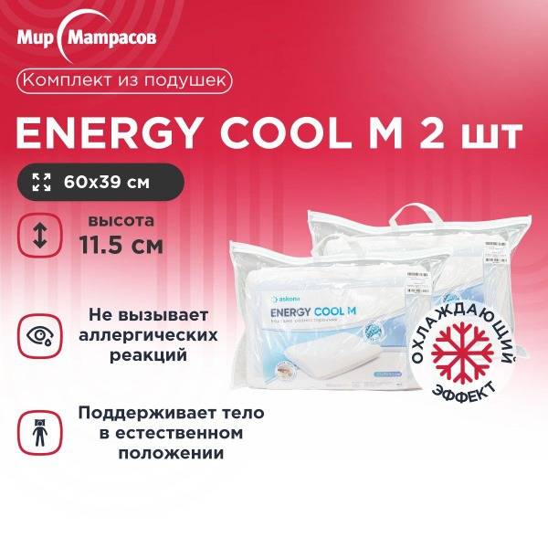 Experience ultimate sleep comfort with the Energy Cool M pillow set (2-pack). This innovative pillow features dual-sided design for personalized comfort: luxuriously supportive memory foam on one side and cooling gel on the other. The breathable, dual-sided cover further enhances temperature regulation, keeping you cool and comfortable all night long. Memory foam provides excellent pressure relief and support, ideal for back and side sleepers. Enjoy superior quality and restful sleep with this premium pillow set.