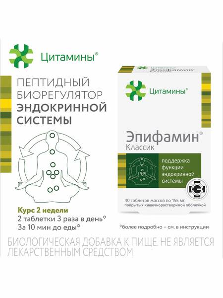 </section> <section>Epifamin® Classic, a premium polypeptide bioregulator from the Cytamins® family, offers targeted support for your endocrine system. These enteric-coated 155mg tablets are formulated to interact with pineal gland cells, promoting healthy gene expression and protein synthesis for restored function. Fortified with essential nutrients, Epifamin® Classic aids cellular metabolism. It helps regulate hormones, bolster immunity, normalize sleep, and provide antioxidant benefits by supporting pineal gland health.