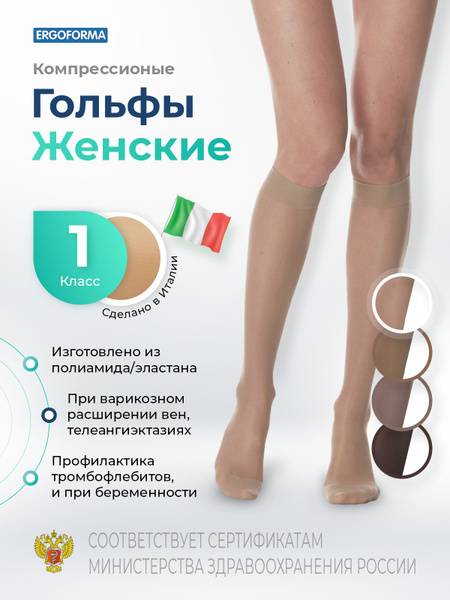 Experience superior comfort and support with Ergoforma's dark beige compression socks, designed for the prevention and treatment of venous insufficiency. These first-class compression socks provide graduated compression – 100% at the ankle, gradually decreasing to 70% below the knee – promoting healthy blood flow and reducing venous pressure. This gentle yet effective compression stimulates the venous pump, alleviating swelling, fatigue, and the discomfort associated with varicose veins and spider veins.