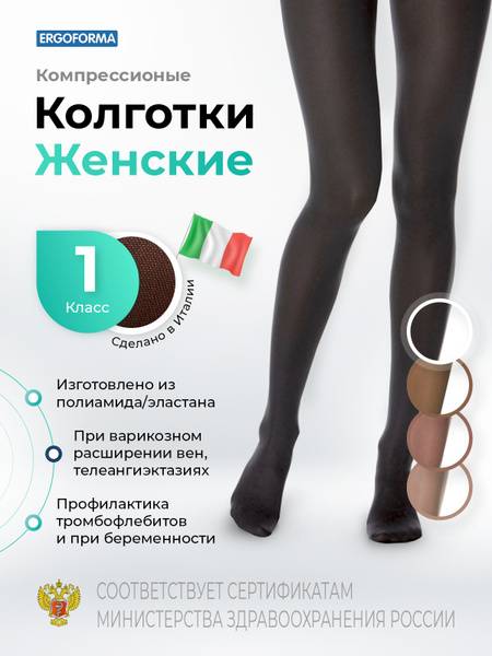 Ergoforma Class 1 compression stockings (112) provide everyday support for varicose veins, swelling, and long flights. Recommended for varicose veins, multiple telangiectasias (small vessel dilation), preventing deep vein thrombosis, and acute thrombophlebitis. (See size chart in the second image.) These compression stockings are ideal during and after pregnancy, for persistent edema, post-surgery and phlebosclerotic vein treatment, and chronic venous insufficiency.