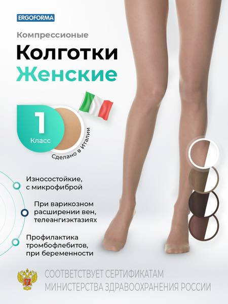 Ergoforma UP EU 112 compression stockings (Class 1 compression, dark beige) provide everyday support for varicose veins, edema, and long flights. Recommended for: