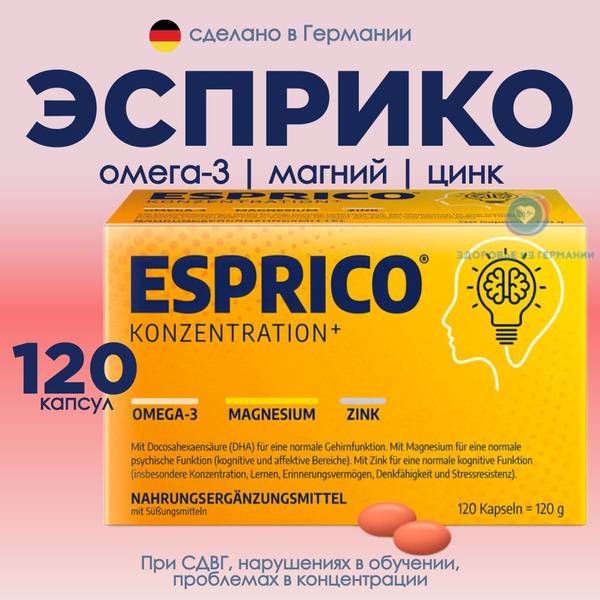Esprico chewable vitamins are a natural, German-made supplement formulated to support cognitive function, improve focus and concentration, and reduce hyperactivity and impulsivity in children. This innovative formula combines Omega-3 fatty acids (EPA & DHA from fish oil), magnesium, and zinc – essential nutrients for healthy brain development and function. Esprico helps children excel academically by boosting memory, enhancing concentration, and providing support during periods of intense mental exertion. Suitable for children aged 5 and over, Esprico's delicious chewable capsules offer a convenient and palatable way to support your child's cognitive well-being. Clinically tested for safety and efficacy, Esprico is a trusted choice for parents seeking a natural solution to help their children thrive. Order your supply today and empower your child's learning journey!