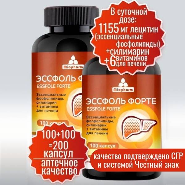 Essfol Forte, Myopharm, liver support, liver health, lecithin, silymarin, B vitamins, vitamin B12, vitamin E, phospholipids, hepatoprotector, detoxification, liver cleanse, liver regeneration, fatty liver, cirrhosis, hepatitis, antioxidant, milk thistle, Russia, pharmaceutical grade, 200 capsules.