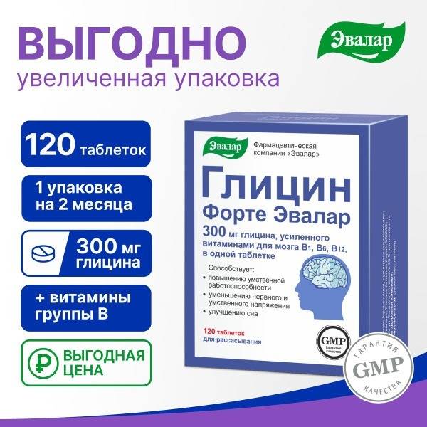 Experience superior stress relief and improved sleep with Evallar Glycine Forte. Each chewable tablet delivers 300mg of Glycine, three times the amount found in standard tablets, enhanced with a naturally balanced blend of essential B vitamins (B1, B6, B12) for optimal brain function. This potent formula offers fast-acting relief from nervous tension and mental fatigue, promoting improved focus, concentration, memory, and sleep quality. With no artificial flavors and manufactured to GMP pharmaceutical standards, Evallar Glycine Forte provides effective, dependable support without forming dependencies. The large 120-tablet pack offers exceptional value, providing a two-month supply for one person or a one-month supply for two. Choose Evallar Glycine Forte – feel the difference.