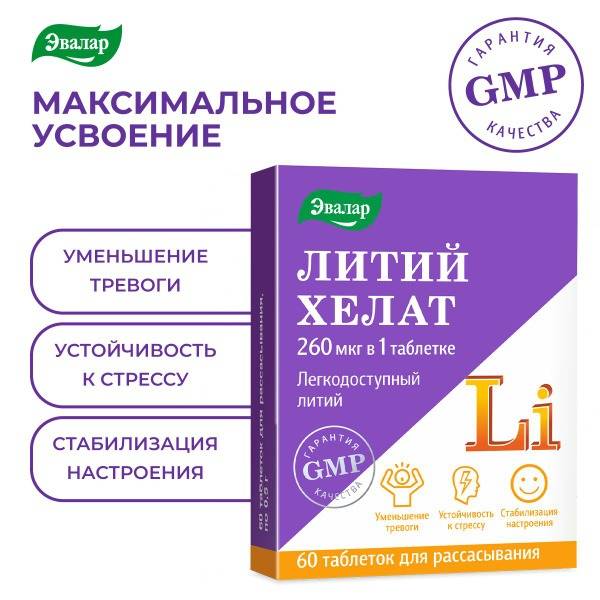 Lithium is a vital trace element essential for the proper functioning of numerous enzymes, hormones, vitamins, growth factors, and the immune and nervous systems. Evalar Lithium Chelate tablets replenish your body's lithium levels, contributing to: