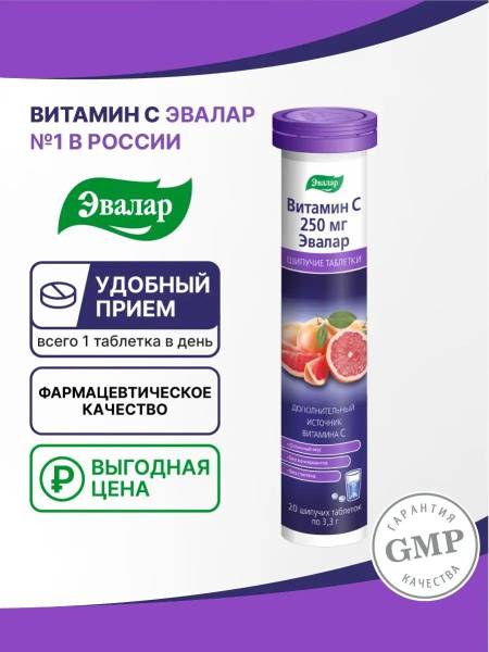 Support your body's natural defenses with Evalar Vitamin C 250mg Effervescent Tablets. Vitamin C is a powerful antioxidant known for its crucial role in immune function. These convenient tablets help strengthen your body's resistance to common illnesses like colds and flu, as well as environmental stressors such as chemical toxins, overheating, chilling, and oxygen deprivation.
