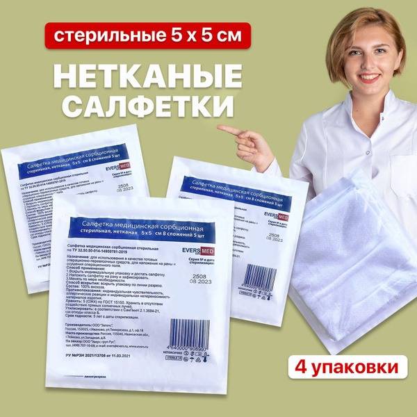 Eversmed sterile, non-woven, absorbent medical wipes (5x5cm, 8-ply) offer superior safety and performance. Unlike traditional gauze, these 100% viscose wipes provide a reliable alternative for various medical applications. Their inward-folded edges prevent unraveling and ensure complete safety. These highly absorbent wipes are ideal for wound dressing, drainage, hemostasis (stopping bleeding), and protecting wounds from external contamination. Suitable for use in surgical procedures and general wound care, they are easily secured with bandages or medical tape. Sterilized by radiation, these wipes effectively absorb wound exudate, prevent microbial penetration, and promote a clean, breathable wound environment. Their conformable nature allows for precise application to various wound types, even when combined with topical medications. Each pack contains 5 wipes; this listing includes 4 packs.