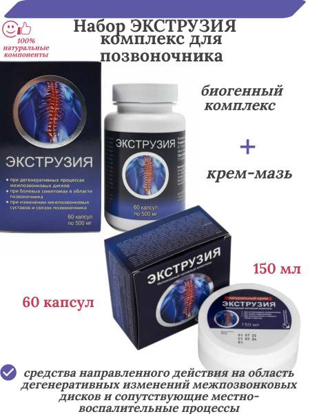 Experience the Extrusia Set, a comprehensive solution for back and neck pain relief and spinal health. This powerful combination includes 60 high-potency capsules and a 150ml cream, working synergistically to support your overall well-being. The capsules contain a unique blend of nutrients designed to strengthen intervertebral discs, promote healthy spinal function, and reduce pain associated with herniated discs. Regular use may significantly improve your comfort and quality of life. The accompanying cream provides potent analgesic and anti-inflammatory relief, soothing aching muscles and joints. Easy to apply and quickly absorbed, it offers comfort and promotes faster recovery. Whether you lead an active lifestyle or simply wish to proactively protect your spinal health, the Extrusia Set is an ideal choice. Prioritize your well-being and enjoy lasting mobility and flexibility. Choose Extrusia for reliable support and a healthier, happier you.