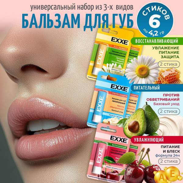 Description: Experience ultimate lip care with the Exxe Lip Balm 6-pack. This set includes three varieties of intensely hydrating and protective lip balms (two of each): Nourishing Ultra Protection, Restorative 3-in-1, and Hydrating Vitamin. Formulated with natural ingredients, each balm deeply nourishes, preventing dryness and chapping. Their lightweight texture absorbs quickly, leaving no greasy residue, perfect for everyday use, under makeup, or on its own for a natural shine. The convenient packaging makes them ideal for on-the-go touch-ups, offering protection from harsh weather and sun. Keep your lips healthy, soft, and beautifully nourished with Exxe. Each balm is 4.2g.
