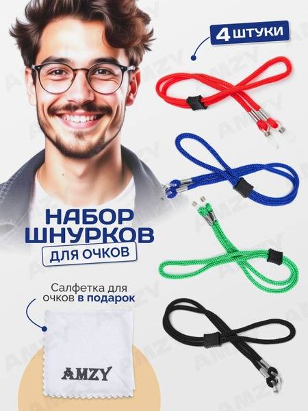 An eyeglass holder set designed to secure frames with flexible silicone holders. The set includes four holders in green, blue, red, and black, plus a microfiber cloth for lens care.