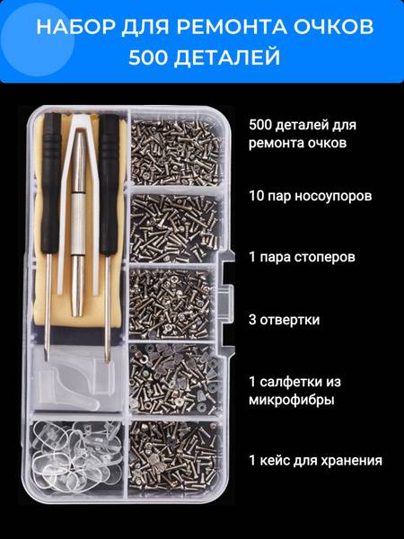 Complete eyeglasses repair kit for most common eyeglass and sunglass repairs. This handy kit includes a wide variety of screws (500+), nose pads, screwdrivers, tweezers, microfiber cleaning cloth, and more – everything you need to fix broken frames quickly and easily.