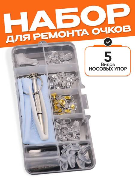 This essential **eyewear repair kit** features a durable **storage case**, a **microfiber cleaning cloth** for crystal-clear vision, a generous selection of **14 types of screws** for eyeglass repair, **2 pairs of general nose pads**, **tweezers**, a **universal screwdriver**, and **5 types of nose pads (5 pairs each)**. Keep your glasses looking and feeling like new with this indispensable **glasses maintenance kit**.