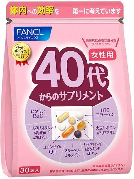 Fancl, women's supplement, 40+, Japan, dietary supplement, collagen, isoflavones, vitamins, antioxidants, omega-3, bone health, skin health, hair health, nail health, cardiovascular health, eye health, brain health, cholesterol, anti-aging, beauty supplement, health supplement, Japanese supplement, 30 packets.