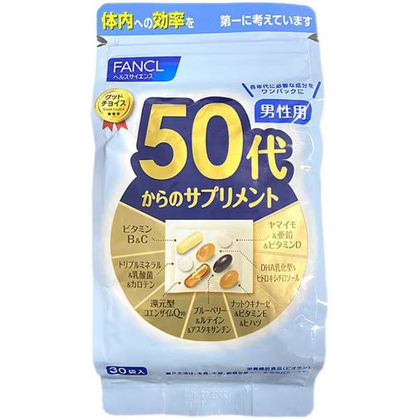 Fancl 50, Japanese vitamins, men's vitamins, vitamins for men over 50, men over 50 supplements, prostate health supplements, cardiovascular health supplements, cognitive function supplements, energy supplements, eye health supplements, Japanese supplements, 30 day supply, Hesperidin, Chitosan, Curcumin, Omega-3, Nattokinase, Ginkgo Biloba, Blueberry Anthocyanins, Lutein, Zeaxanthin, Astaxanthin, Coenzyme Q10, Vitamin C, B vitamins, antioxidant, healthy aging, men's health, immune support, digestion support, blood pressure support.