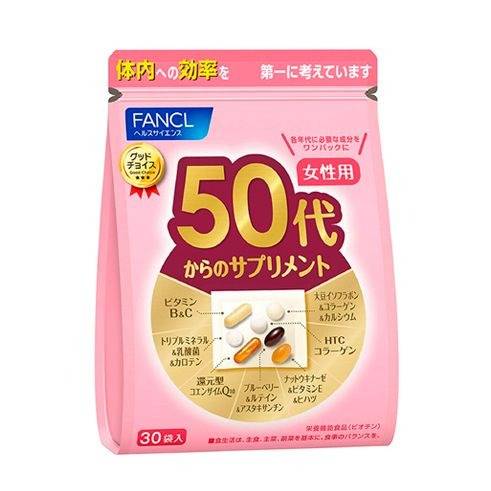 Description: Support your health and well-being after 50 with FANCL's comprehensive women's multivitamin complex. This 30-day supply combines essential vitamins and minerals with targeted ingredients to address age-related changes. Enjoy the benefits of hyaluronic acid and HTC collagen for skin elasticity and tone. Soy isoflavones help alleviate menopause symptoms and support hormonal balance. Powerful antioxidants combat cell damage and protect against free radicals. Maintain sharp vision with bilberry extract rich in lutein and cyanidin-3-glucoside. Support cardiovascular health and cognitive function with nattokinase and ginkgo biloba. Enhanced calcium absorption, thanks to Tsuintosu, contributes to strong bones. This unique formula also includes: bilberry and lutein for eye health; nattokinase and DHA for heart, vascular, brain, and immune support; ginkgo biloba extract with 10 flavonoids; CoQ10 for energy and antioxidant protection; essential B and C vitamins; Fancl's patented low-molecular-weight HTC collagen for skin elasticity; soy saponins and hyaluronic acid for hydration and UV protection; and calcium and magnesium for bone health and nervous system support.