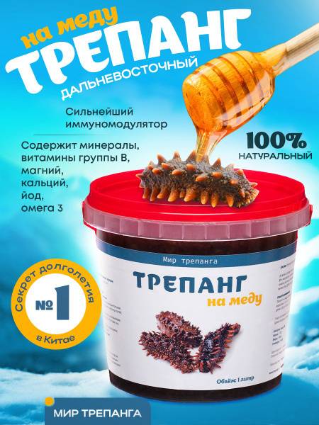 Far East sea cucumber, sea cucumber honey, trepang honey, linden honey, Mir Trepanga, immune support, antiviral, anti-inflammatory, cardiovascular health, cholesterol reduction, sleep aid, depression relief, prostate health, anemia, digestive health, metabolism boost, weight management, skin regeneration, gynecological health, men's health, potency, detoxification, muscle recovery, 1 liter, prostate inflammation, herpes treatment