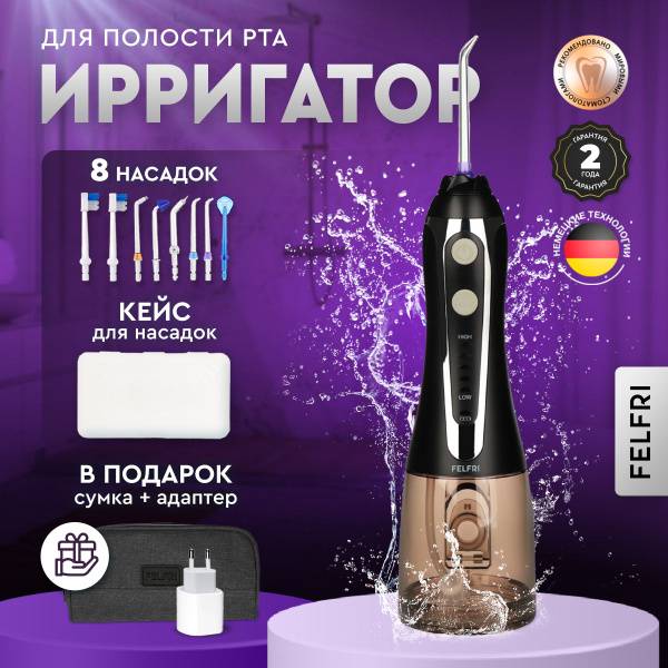The FELFRI oral irrigator delivers professional-level oral hygiene right at home. This powerful water flosser boasts five cleaning modes and eight interchangeable nozzles, ensuring a comprehensive clean for every oral care need. The kit includes two nozzles for daily cleaning, two specifically designed for caries prevention, and four additional nozzles for tongue cleaning, nasal irrigation, and enamel polishing. Effectively remove plaque and tartar, even in hard-to-reach areas.