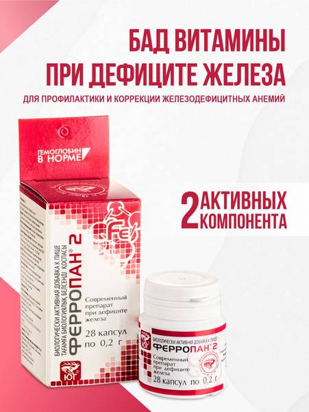 Description: Ferropan 2 is a comprehensive vitamin and iron supplement designed to prevent and treat iron-deficiency anemia. It improves blood formation, increases hemoglobin levels, enhances mental and physical performance, and supports a healthy immune system. This supplement provides a potent adaptogenic and tonic effect, serving as an additional source of iron and Vitamin C. Recommended dosage: 1 capsule daily during meals with warm boiled water. Treatment course: 20-28 days. Nutritional information and percentage of recommended daily intake for iron and Vitamin C are provided inside the packaging. Contraindications: individual intolerance to the product's components, peptic ulcer disease, pregnancy, and breastfeeding.
