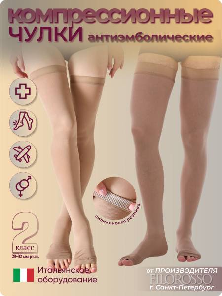 Filorosso Class 2 compression stockings (23-32 mmHg) offer effective protection against thrombosis, thrombophlebitis, and thromboembolic complications during surgery, childbirth, and recovery. These medical-grade stockings, featuring a silicone band, are crafted from a special knit for superior comfort and support. A detailed size chart is conveniently displayed in the product images.