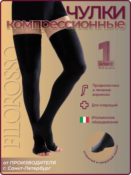 Filorosso Class 1 compression stockings offer superior comfort and support for optimal leg health. These black stockings provide 18-22 mmHg of graduated compression, promoting healthy blood circulation and reducing the risk of venous stasis, swelling, and discomfort. Perfect for preventing thrombosis, thrombophlebitis, and thromboembolic complications, they're ideal for: