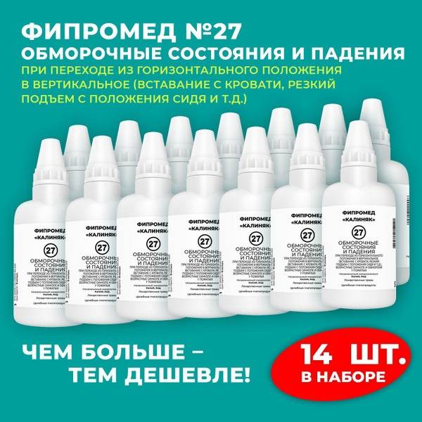 Fipromed #27 is a herbal remedy specifically formulated for seniors (60+) to address fainting spells and falls, particularly those triggered by changes in posture (rising from bed or a seated position). This phytopreparation helps combat age-related syncope and dizziness in older adults. Fipromed #27's unique blend of potassium, iodine, medicinal herbs, and bee products promotes overall well-being and combats the underlying causes of fainting and falls.