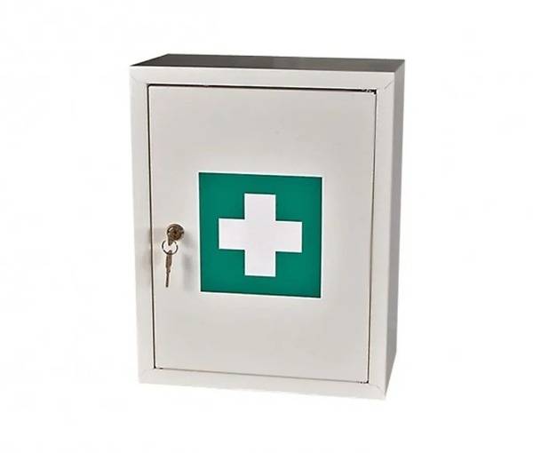 Description: This sturdy metal first-aid cabinet provides secure storage for medications and first-aid supplies. Measuring 300 x 250 x 100 mm (H x W x D), it features a single door with a key lock for added security and protection from light. The powder-coated steel construction ensures durability and a clean, professional appearance. Ideal for offices, businesses, and facilities of all sizes, this wall-mounted cabinet helps maintain a safe and organized environment. A first-aid decal is available separately. Ensure the safety and well-being of your employees and visitors with this essential piece of safety equipment.