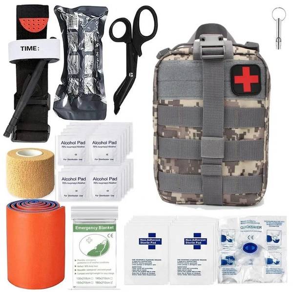 Description: This comprehensive IFAK (Individual First Aid Kit) is meticulously designed for emergencies during outdoor adventures, hunting, camping, travel, natural disasters, and accidents. Perfect for first responders and adventurers alike, this trauma kit prioritizes efficient bleeding control and fracture management. Features include a military-grade tourniquet, Israeli combat bandage, self-adhesive bandages, antiseptic wipes, and non-stick pads for effective hemorrhage control. A 36-inch lightweight, reusable, and waterproof medical splint provides reliable bone and soft tissue immobilization, complemented by a 2-inch self-adhesive bandage for secure limb support. The generously sized kit (8" x 7.5" x 3.8") easily accommodates all essential supplies, making it ideal for solo adventurers or teams. Durable MOLLE straps with buckles offer secure attachment to any MOLLE-compatible gear. A rip-away panel allows for quick access ("grab-and-go") functionality, while a dual-zipper design and removable inner pouch provide easy organization and access to vital supplies. This IFAK also includes a universal adjustable car headrest mount for convenient transport.