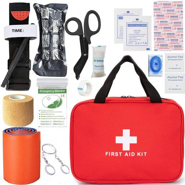 Description: Our comprehensive first-aid kit is equipped with 14 essential items for any emergency. Inside you'll find a tourniquet, 6-inch Israeli bandage, trauma shears, splint roll, emergency blanket, alcohol prep pads, gauze pads, PBT bandage, adhesive bandage rolls, medical tape, wire saw, self-adhesive bandage, face shield, and a durable first-aid bag. Perfect for shooting, hunting, camping, hiking, and all outdoor activities. Prepared for anything.