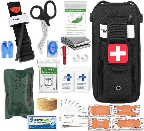 - Additional Essentials: 1 pair of gloves, 1 x burn treatment, 1 x whistle, 1 x elastic band, 16 x alcohol wipes, 5 x cotton swabs, 1 x tactical case.