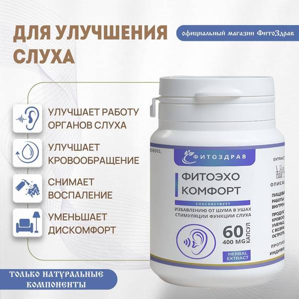 PhytoEchoComfort is a natural vitamin complex formulated with extracts of healing herbs and medicinal plants to improve hearing and prevent age-related ear diseases. This supplement helps reduce inflammation, alleviate earache (otitis media), and eliminate tinnitus and ear congestion. Offering powerful internal support for your auditory system, it provides results comparable to ear drops like Uchovit. Key benefits include: