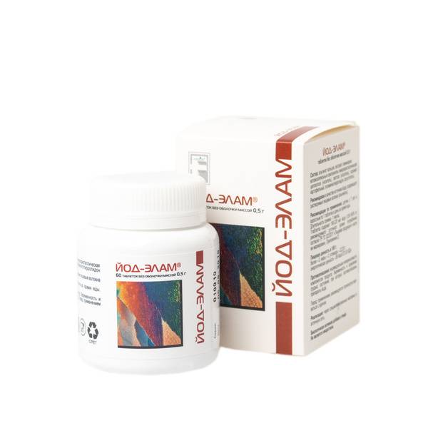 Fitolon Iodine-Elam dietary supplement provides 190-220 mcg of iodine per tablet (127-147% of the recommended daily intake according to TR CU 022/2011 "Food Products in terms of their labeling"). Each tablet contributes to iodine intake and provides soluble dietary fiber in the form of alginates. This 60-tablet pack offers a one-month supply of uncoated tablets (0.5g each). Nutritional information per 100g: protein 0g, fat 0g, carbohydrates 22.28g, energy value 89kcal. Awarded the Green Cross mark by the National Organization of the International Green Cross in Russia "For contribution to improving people's health and producing useful products," Iodine-Elam helps address iodine deficiency, supports calcium levels, and supplements the diet with essential macro- and micronutrients, and irreplaceable amino acids. Suitable for those seeking to supplement their iodine and dietary fiber intake.
