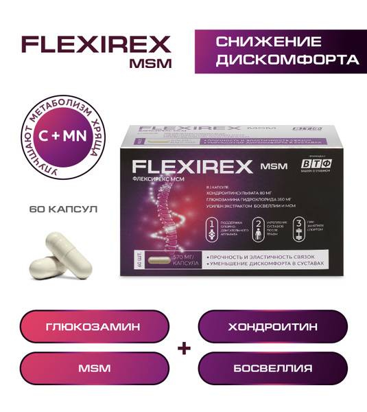 Keywords: Flexirex MSM, joint pain, inflammation, glucosamine, chondroitin, MSM, boswellia, vitamin C, manganese, joint support, cartilage health, osteoarthritis, pain relief, supplement, 60 capsules