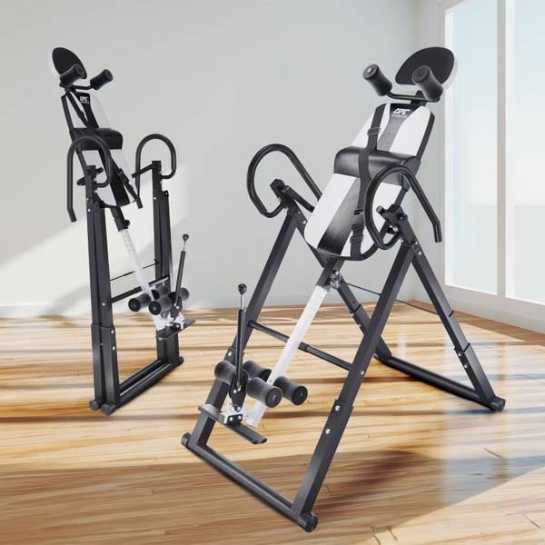 Description: The DFC IT6312A-W Inversion Table offers a convenient and effective way to improve posture, strengthen ligaments, and boost circulation. Featuring a white backrest with headrests and a removable lumbar support pillow for enhanced comfort, this inversion table includes a safety strap and double rollers for ease of use. With a 150 kg (330 lb) weight capacity, its adjustable angle limiter bar offers three incline positions for customized workouts. Its foldable design ensures easy storage and portability, making it perfect for home use.