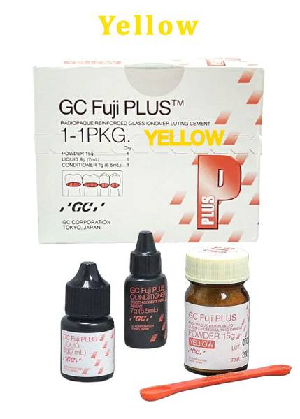Keywords: Fuji Plus YELLOW, glass ionomer cement, dual-cure cement, composite-reinforced cement, dental cement, crown cement, bridge cement, inlay cement, onlay cement, zirconia cement, ceramic cement, metal cement, post cement, dental restoration, restorative dentistry, aesthetic dentistry, high-strength cement, fast-setting cement, easy-to-use cement.