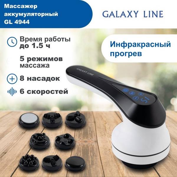 Experience the ultimate relaxation and muscle recovery with the Galaxy LINE GL4944 cordless body massager. This powerful percussion massage gun boasts a 16W motor with 2700-3300 RPM for deep tissue massage, improving circulation and relieving muscle tension. Choose from 9 interchangeable massage heads and 5 massage modes with 6 intensity levels to target specific muscle groups and address various needs – from post-workout recovery to everyday stress relief. Enjoy the added benefit of infrared heat, enhancing muscle relaxation and recovery. The intuitive touch screen control panel and LED display make operation simple, while the built-in 15-minute timer and long-lasting 1800mAh Li-ion battery (up to 1.5 hours of use) provide convenient, cordless massage sessions. Compact, lightweight, and rechargeable via the included AC adapter, the Galaxy LINE GL4944 is the perfect at-home massager for personal well-being.