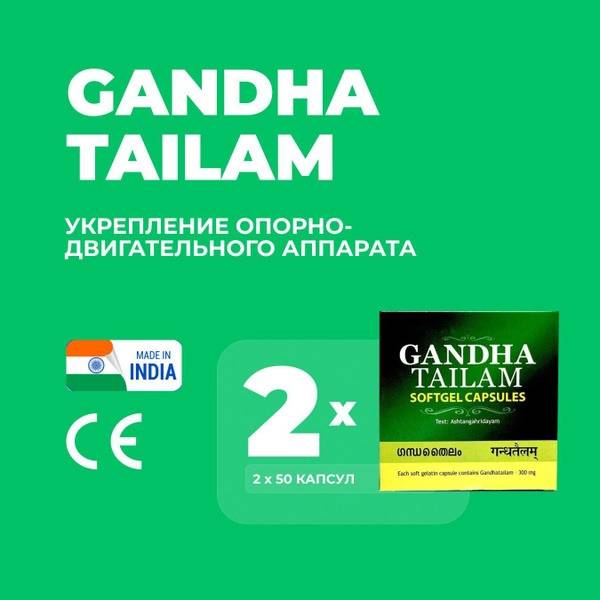 Kottakkal Gandha Tailam, Gandha Tailam Softgel, joint pain relief, bone health, osteoporosis treatment, arthritis relief, muscle recovery, ligament support, fracture healing, sprain treatment, dislocation treatment, Ayurvedic medicine, herbal supplements, Vata, Pitta, bone mass, bone strength, muscle elasticity, 100 capsules, softgel capsules.