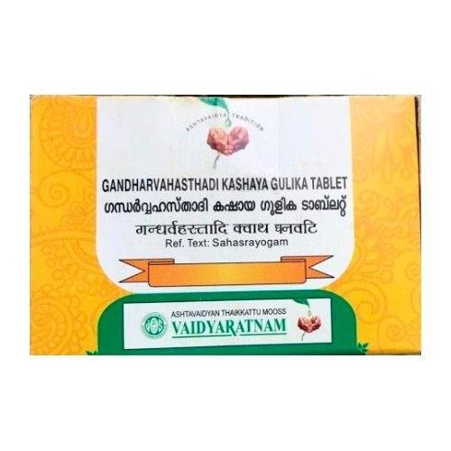 Experience the transformative power of Gandharvahasthadi Kashaya Gulika Vaidyaratnam, a 100-tablet Ayurvedic formulation designed to support healthy digestion and overall detoxification. This expertly crafted blend utilizes the synergistic properties of natural ingredients including Haritaki, ginger, Burbur, Ricinus communis, Holarrhena antidysenterica, and more, to gently cleanse the intestines and enhance Agni (digestive fire). Gandharvahasthadi Kashaya Gulika may help manage weight, purify the blood, alleviate joint pain, and in some cases, support thyroid and women's reproductive health. Indicated for various digestive issues such as indigestion, bloating, constipation, abdominal colic, excess gas, fluid retention (edema), joint and muscle pain, and sluggish bowel movements. It addresses imbalances of Vata dosha, promoting overall well-being.