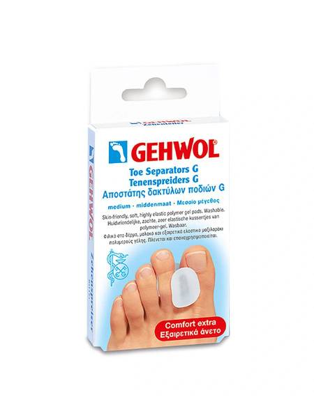 Gehwol Med Gel Toe Separators provide gentle separation of closely pressed toes, preventing friction, blisters, and the formation of calluses and corns. Made with a silicone-free formula containing medical paraffin and mineral oils, these separators continuously soften and protect the skin. They conform perfectly to the natural shape of your toes, readily returning to their original form when pressure is released. Hypoallergenic and free of synthetic fragrances, these separators are resistant to bacterial growth and easily cleaned with warm water and soap. They are also compatible with all Gehwol foot powders. Important Note: Do not apply to open wounds or inflamed skin. This 3-pack contains medium-sized separators.