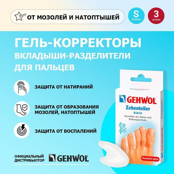 Experience superior comfort and protection with Gehwol Gel Toe Separators. These soft, flexible, and specially-shaped gel polymer cushions effectively relieve pressure between tightly pressed toes, preventing friction, blisters, and calluses. Enriched with paraffin and mineral oils, the gel gently softens and protects skin, reducing the formation of hard skin and corns. The separators conform to your foot's natural shape for a comfortable, customized fit. Hypoallergenic and easy to clean with mild soap and water, these versatile protectors can also be treated with the included foot powder for added comfort. This pack includes three small separators (35mm length, Item #653625421) and a 4g packet of Gehwol foot powder. Buy with confidence from an authorized Gehwol distributor in Russia, ensuring fresh stock and guaranteed authenticity. We thank you for your loyalty over our 30 years of service in Russia.