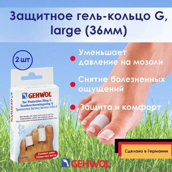 Description: Experience ultimate comfort and protection with Gehwol's protective gel toe rings. These soft, elastic polymer-gel rings cushion pressure points, providing relief from blisters, calluses, and sore areas. Infused with paraffin and mineral oils, the specialized gel continuously softens and protects your skin, effectively preventing the formation of hard skin and calluses. The flexible gel conforms perfectly to the natural shape of your toes for a comfortable, personalized fit. Hypoallergenic and silicone-free, these rings are easy to clean with warm water and soap. They can also be treated with talcum powder if needed. Important: Do not use on open wounds or inflamed areas.