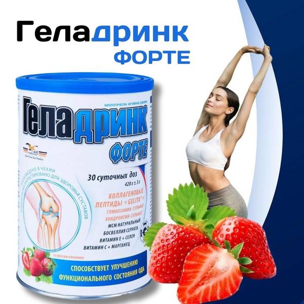 Geladrink Forte is a comprehensive chondroprotector that restores normal cartilage metabolism, stimulates natural collagen synthesis, enhances antioxidant protection, and provides additional nutrients to joints and the spine.