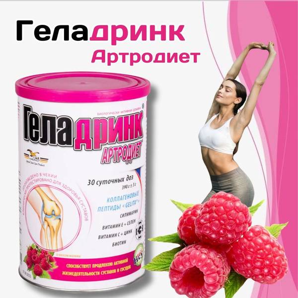 Geladrink Arthrodiet, joint support, vascular health, collagen peptides, anti-inflammatory, connective tissue, joint pain, spine health, bone health, cartilage health, vitamin B6, vitamin B12, folic acid, silymarin, vitamin C, selenium, vitamin E, zinc, biotin, vitamin D3, Gelita collagen, raspberry flavour, dietary supplement, arthritis support, mobility support, healthy aging.