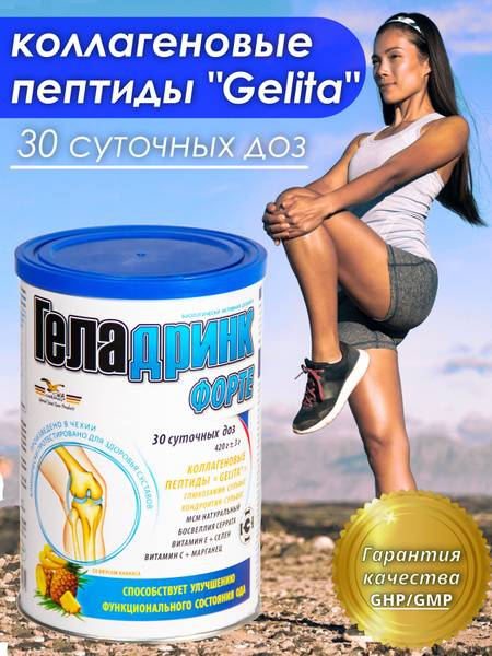 Geladrink Forte is a comprehensive chondroprotector that restores normal cartilage metabolism, stimulates natural collagen synthesis, enhances antioxidant protection, and provides joints and spine with essential nutrients. It contains peptide collagen hydrolysate, glucosamine and chondroitin sulfates, methylsulfonylmethane (MSM), micro and macro-elements, and vital vitamins to improve joint and spinal function and mobility. A daily dose (14g) contains: Gelita® Peptide Collagen Hydrolysate – 8000mg; Glucosamine Sulfate – 1500mg; Chondroitin Sulfate – 800mg; Natural MSM – 600mg; Boswellia Serrata – 100mcg; Vitamin C – 100mg; Vitamin E – 50mg; Selenium – 50mcg; Manganese – 2mg. Gelita® Peptide Collagen Hydrolysate supports joints and spine, providing vital amino acids (glycine and proline) to enhance physiological collagen production, regenerate connective tissues, and improve joint mobility. Glucosamine and chondroitin sulfate protect cartilage, improve its elasticity, and stimulate the synthesis of aminoglycans and hyaluronic acid. MSM, a natural source of organic sulfur, supports collagen fiber structure and healthy cartilage and bone formation. Boswellia Serrata extract may reduce inflammation and improve joint mobility. Vitamins C and E, and Selenium act as potent antioxidants, protecting against free radical damage. Manganese supports bone and connective tissue formation and collagen synthesis. Geladrink Forte contributes to the overall health and function of your musculoskeletal system.